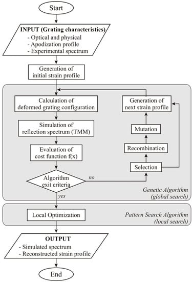 Bettini et al. [57] in 2015 proposed a method for spectral reconstruction that is illustrated in Figure 8, which is based on two rounds of optimization; the method is applied for strain sensing. The algorithm starts by inputting the optical parameter of the grating (start/end wavelength, chirp rate, strain sensitivity) and the physical dimensions of the grating. These parameters are set in reference condition (with the initial strain value reported as a reference). Based on these parameters, by means of the CFBG model (in [57] the model is accounted based on the transmission matrix model, TMM), it is possible to analytically derive the optical spectrum of the CFBG.