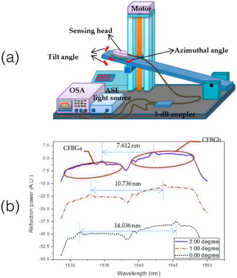 - Chang, H.Y.; Chang, Y.C.; Liu, W.F. A highly sensitive two-dimensional inclinometer based on two etched chirped-fiber-grating arrays. Sensors 2017, 15, 2922. [Google Scholar] [CrossRef] [PubMed]