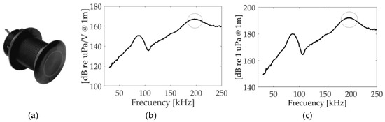 The knowledge of the transmitter behavior is essential for the proposed application. Figure 2b, shows the Transmitting Voltage Response (TVR), which is the ratio of the pressure signal emitted to the applied voltage, for Airmar P19. It has been measured at the lab using tone bursts at different frequencies. The carrier frequency of the modulation signal corresponds to the resonance frequency at 200 kHz and the TVR at this frequency is 167 dB re µPa/V@1 m. In Figure 2c, the values of sound pressure level reached in our experiment are presented, with a value for the frequency of 200 kHz of 195 dB re µPa@1 m. The directivity of the transducer is another important parameter for the proposed study. The transducer presents a beamwidth (@−3 dB) at 200 kHz of 11°.