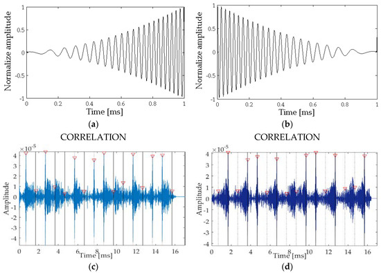 Figure 4c,d show the results of the cross-correlation between the received signal filtered at low frequency containing the 16-bits string (Figure 3c, yellow) with the expected secondary beams for bits 1 and 0 (Figure 4a,b). Thus, one can observe that correlating with bit 1 the cross-correlation amplitudes for the positions of bit 1 of the string are much greater than the corresponding amplitudes for bit 0. In the same way, the positions of bit 0 are clearly enhanced in the correlation amplitudes when correlating with bit 0.
