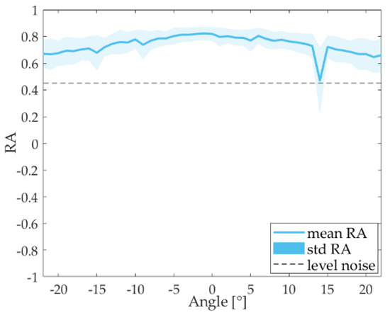 In Figure 5, the RA parameter averaged for all bit positions is presented as a function of the directivity angle of the emitter. We can observe that for this case all RA values are above the noise level region, which is between ±0.45, so the detection is produced for all angles (± 25°).