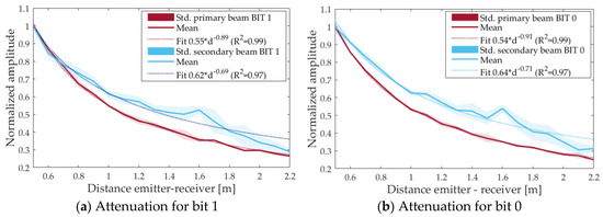 Normalized amplitude of the received signal for primary (red) and secondary (blue) beam as a function of distance between emitter and receiver. Std means the standard deviation. (a) for bit 1; (b) for bit 0.
