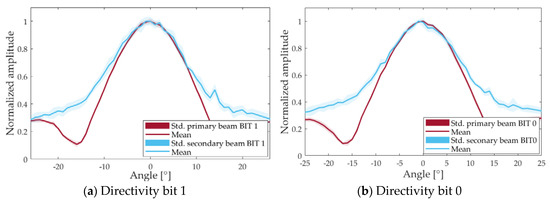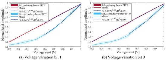 Normalized amplitude of the received signal for primary beam (red) and secondary beam (blue) as a function of voltage sent of emitted signal (i.e., feeding voltage before the amplifier). Std. means the standard deviation. (a) for bits 1; (b) for bits 0.