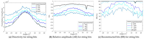 Influence of the noise in the secondary beam for the string of bits (experimental) and the ones adding some white noise of different amplitude: 2, 5, 7 and 10 mV. (a) Directivity; (b) Relative amplitude; (c) Reconstructed bits.