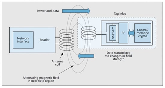 Communication between a reader and a tag is through a mechanism called load modulation. The RFID reader consists of a radio frequency module, a control unit and an antenna coil which generates high frequency electromagnetic field. While, the Tag is a passive component that consist of just an antenna and an electronic microchip, when it gets near to electromagnetic field of the transceiver, due to induction, a voltage is generated in it is antenna coil and this voltage serves as power for the microchip (Figure 2)