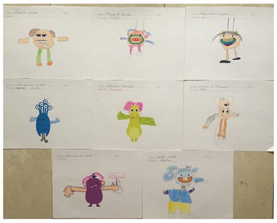 Another determining factor of the child is the result of an activity that was carried out with them, in which they drew a certain character. The activity is described in a study by Cano et al. []. The results obtained in the drawings showed that the children knew each part of the body of a person, since this was the first thing that they drew (Figure 3); the use of the colors and the combination of these likewise. It is important to mention that one of the parts that no child was drawing were the ears or their aid device (hearing aid or implant). Moreover, these children were newly implanted and their language acquisition was very low, so they experienced difficulty when assigning a name to the character. Their name for the character was almost always related to words they already knew, for example: dad, mom, or proper names.