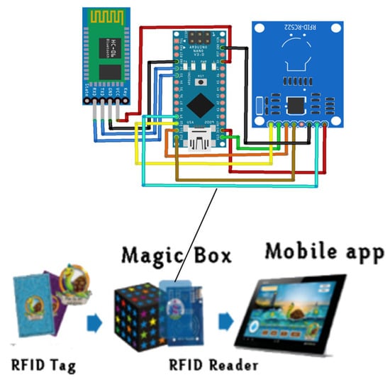 RFID sensors use radio waves to identify people or objects (Figure 1). The most common way they are used is that there is a unique number for each object labeled with an RFID tag []. Different authors have proposed a variety of potential applications using RFID technology in the design of interactive systems for children [,]. The work presented by Motoyoshi et al. [] integrates RFID technology in an educational context for building blocks. A work presented by Valero & Adam [] describes the advantages and limitations of RFID technologies, such as the limitations of interference with materials can affect their communication. Another work that has used RFID is presented by the University of Utah [], an application of RFID for a care robot for visually impaired people. The system consists of a mobile robot and passive RFID tags placed in indoor environments.