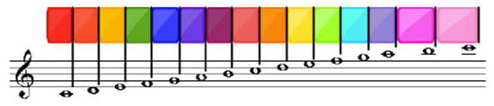 - Correa, R.; Osorio, A.; Cano, S. CASETO: Sistema Interactivo Basado en Sinestesia Para La Enseñanza/Aprendizaje de la Música Para Niños Con Discapacidad Auditiva Entre 7 a 11 Años. In Proceedings of the 12th Congreso Colombiano de Computación, Cali, Colombia, 19–22 September 2017; Volume 12, pp. 1–15. [Google Scholar]