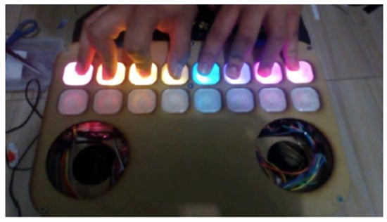 CASETO is a non-traditional type of interaction (Figure 11) that uses a number of electronic components such as push-buttons, activated when pressed with a finger. The RBG LED diodes and speakers are used as a feedback of the action performed by pressing a button. With the LED diodes, feedback is visual, while with the two speakers it is auditory. An ArduinoMega was used to capture each one of the states of the 16 buttons that represent a musical note. So the information is captured through the digital ports of the Arduino and sent by Bluetooth to the mobile application. The type of connectivity that was used was Device-to-Device through a Bluetooth communication. The type of sensor that was used was a tactile sensor and, as feedback, light emitting diodes were used, which is integrated to give a visual response of the received action and a pair of speakers to amplify the audio. This type of response works as communication with the user but may change depending on the child’s limitation.