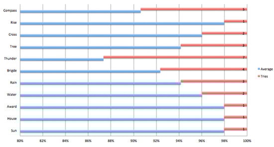 The first evaluation measured variables that might validate whether or not the words associated with each level were the correct ones (Figure 10). This evaluation was carried out with the children of the Institute of Blind and Deaf Children of Valle del Cauca. The first level, which corresponds to the yellow card, contains words such as cross, tree and climb, while the green card contains the words water, rain, bridge and thunder (vertical axis). The children found some difficulty with words comprising two consecutive consonants or two consecutive vowels, or both, such as thunder and cross. In Figure 10, the word thunder can be seen to have the highest number of attempts (horizontal axis), followed by compass and bridge. It is also worth pointing out that these are not very common words in everyday use. The word sun presented least trouble. It is a monosyllabic word and has a syllabic combination of consonant-vowel. It should also be borne in mind that the words were selected according to the scenario of the game. However, for transitional children and first-graders these types of words are difficult.