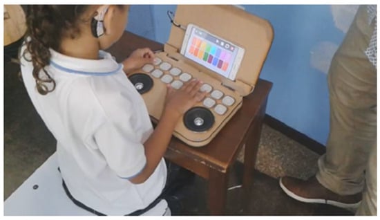For the second proposal, the CASETO tool was developed to teach music to children with hearing disabilities. Interaction with music is not only made in an auditory way but can be expressed visually or using other senses such as touch through vibrations. So for this proposal the research was based on Christine Sun Kim, a deaf woman from birth who relates sound to art []. With CASETO we wanted to start with something basic that supports children in the teaching of music and musical notes. The children of the INCSVC take a Music course in which they are taught the musical notes, the intonation or a rhythmic pattern to be followed by using colors. A set of activities were also performed, such as associating a musical note with a color, or while listening to a symphonic melody they would draw. It was observed that children can differentiate shades of colors, that is, they can tell the difference between a light blue and a dark blue. So, the decision was made to represent each musical note associated with a color, relating the colors and tones with the musical note, that is, a C Major is represented by a dark red color and a C minor by a light red color. The interaction was intended to be totally physical, in such a way that they could experience the interaction as if it were a real musical instrument, where a musical note accompanied by a color represents each button of the instrument. The mobile application acts as a notebook of activities that guides the child in their interaction. That is why it has two modes of interaction with the application, which relate to two levels of difficulty. The free mode allows the child to experiment with the piano, to understand the interaction and at the same time to create his own music, while the guided mode consists of following the sequence of musical notes of a certain song. However, when the guided mode was evaluated, the children had difficulty following the sequence, since they said they could not relate what was in the physical instrument (buttons that had no color while they were not pressed), with the mobile application that had colored buttons to be pressed (Figure 8). This was very difficult for them, so when they were asked if they had to focus too much on the activity, they responded affirmatively. The evaluation that was carried out with the INCSVC children was subjective, due to their lack of vocabulary for understanding sentences. It was therefore a direct observation evaluation when interacting with CASETO, where eight children (four boys and four girls) participated. Seven out of the eight children had a cochlear implant and one girl had no hearing aid, so her communication system was lip-facial reading. Both groups of children, from ASPAS and INCSV, had difficulties with the buttons, since the material of the keys was very rigid, so they had to press hard. Once they received the visual feedback that the button was lighting with an associated color, it motivated them a lot to continue experimenting with the instrument. The speakers of the tool were exposed, which caused some children to be afraid, thinking that it would harm them but for the girl who did not have a cochlear implant, it was a positive thing because she could feel the vibrations of each musical note, and explored the vibrations more compared to the other children who did have a cochlear implant. A free interaction test was conducted to measure the average time children could spend browsing the interactive system. The average was 2 min and 13 s but mainly because the rest of the children were waiting to interact with the system again. They are also children who are very dependent on the teacher. Usually when they were told to experiment the system freely, most of them felt self-conscious and evaluated, it was like they were expecting instructions. In the guiding mode, some children could not follow the sequence and felt frustrated and did not want to continue doing the activity. It was observed that the manipulation part of the instrument could help the child in visual and motor coordination. Therefore, the interactive experience [,] cannot involve only an educational context but a context that is also therapeutic like CASETO or PHONOMAGIC with an educational content in literacy teaching but at the same time it had a mathematical content because they had to count on advancing to each box and a social content because they had to interact with the other classmates and could support each other.