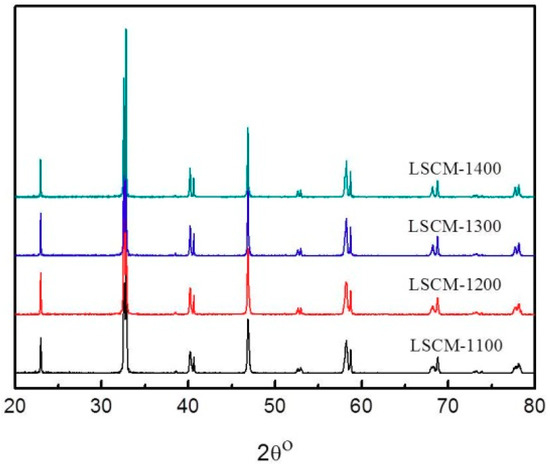 X-ray diffraction (XRD) patterns of the La0.75Sr0.25Cr0.5Mn0.5O3 (LSCM) powders calcined at the temperature of 1100–1400 °C.