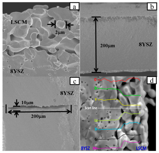 Scanning electron microscopy (SEM) images of (a) LSCM powder calcined at 1100 °C; (b) Micro-structure of LSCM electrode after 1400 °C co-firing with 8YSZ; (c) Diffusion barrier of sensor; and, (d) Energy Disperse Spectroscopy (EDS) image at line scan mode.