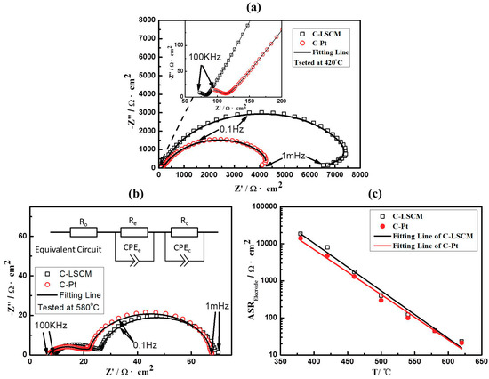 EIS of C-LSCM and C-Pt tested at (a) 420 °C and (b) 580 °C; and, (c) The relationship between area resistance and operating temperature of C-LSCM and C-Pt.
