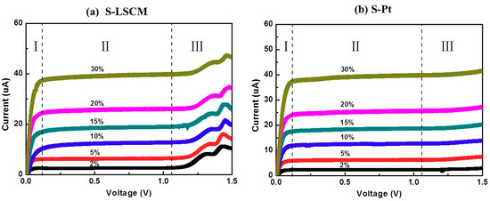Current-voltage characteristic curves of (a) S-LSCM and (b) S-Pt, measured at 580 °C, with the oxygen concentration in the range of 2–30%.