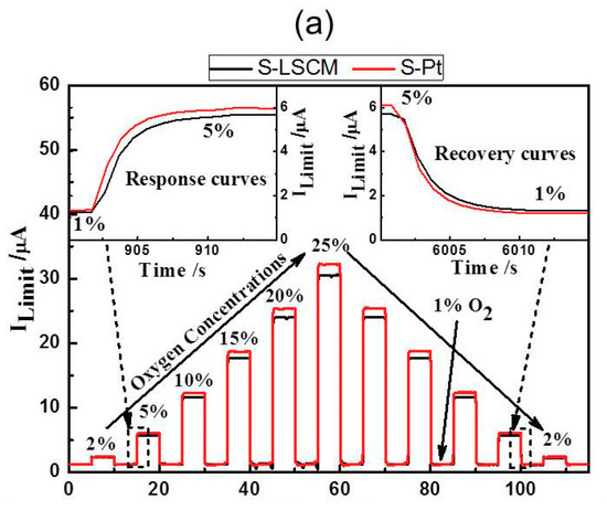 Figure 5 gives the current-voltage (I-V) characteristic curves of the S-LSCM and S-Pt at different oxygen concentrations (measured at 580 °C), with applying the bias voltage in the range of 0–1.5 V. Generally, when the applied bias voltage is below 0.1 V, the current mainly increases linearly with increasing voltage. In this case, the ionic conductivity of YSZ solid electrolyte is dominant before the limiting current occurs at the voltage of lower than 0.1 V. Then, with continuously increasing the bias voltage, limiting current plateau is observed in a wide voltage range of 0.1–1 V. Such satisfactory sensing behavior is due to the excellent electrocatalytic activity of LSCM and Pt, high ionic conductivity of 8YSZ, and desirable diffusion efficiency of the barrier. Nevertheless, the current value increases non-linearly if further increasing the bias voltage. This indicates that the optimal bias voltage for the sensor is within the range of 0.1 to 1 V. Besides, it should be additionally noted that based on the similar I-V characteristics of LSCM (Figure 5a) and Pt (Figure 5b), it can be concluded that LSCM is highly possible to replace the Pt for oxygen sensing. Accordingly, sensing performance of the sensor consisting of LSCM or Pt electrode is evaluated at 580 °C with applying the bias voltage of 0.5 V. The sensor using LSCM electrode gives close sensing behavior with that of the sensor using Pt electrode (Figure 6a and Figure S2 of Supplementary Materials). For example, limiting currents of S-LSCM and S-Pt tested at 20% oxygen are 24.029 and 24.009 μA, respectively. The relative error is within 0.08%. Meanwhile, the response signal of the sensor changes quickly with the changes in the oxygen concentration in the range of 2–25%, and it reaches the steady state in a short time (insect of Figure 6a), the 90% response/recovery time is normally within 7 s, even at the operational temperature down to 420 °C (Figure S3 of Supplementary Materials). Apart from the quick response/recovery rate, a perfect linear relationship between the response signal and oxygen concentration within the tested concentration is witnessed (Figure 6b). The correlation coefficient for the sensor using LSCM or Pt electrode reaches 0.999. For the purpose of adapting the developed limiting oxygen sensor to the real application, resistance to other interfering gases is an ultra-important parameter [21]. Thus, sensing behavior of the limiting current oxygen sensors (utilizing LSCM or Pt electrode) against 5% CO2 or H2O is investigated (shown in Figure 6c). The sensors give acceptable selectivity to oxygen since their response signal is hardly affected by the 5% CO2 or H2O. Furthermore, the identical sensing behavior for the sensor comprised of LSCM or Pt electrode confirms our speculation that LSCM indeed demonstrates high reactivity to oxygen and can replace the Pt to be used in the limiting current oxygen sensor. Table 1 summarized the performance of the reported oxygen sensor using various sensing materials [6,7,10,13,22,23]. In summary, the limiting oxygen sensor comprised of LSCM shows comparable sensing behavior with that of these mentioned counterparts, and minor hysteresis is observed for the sensor using LSCM or Pt electrode with the bias voltage that is below 0.5 V (Figure S4). The negligible hysteresis of the LSCM can be attribute to the tiny polarization at the voltage of 0–0.5 V. Regarding to the high catalytic activity of LSCM to oxygen, it can be interpreted through its high oxygen vacancy concentration. Generally, oxygen reduction over an electrode involves a series of steps, such as gas phase diffusion, oxygen dissociation, and surface diffusion of oxygen ion into the electrolyte layer in the TPB region. The oxygen dissociation and surface diffusion of oxygen ions are closely related to the surface oxygen vacancy concentration. Due to the nonstoichiometry structure of LSCM [14], it contains considerable amounts of oxygen vacancies, leading to oxygen dissociation and surface diffusion of oxygen ions easily, which is rate determining step of catalysis. oxygen dissociation and surface diffusion of oxygen ions can be easily proceeded to rate determining step (i.e.,. Accordingly, the LSCM demonstrates analogous catalytic activity to oxygen with that of Pt. Further discussion can be found elsewhere [14].