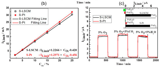 (a) Response transient and (b) Dependency of the response signal on the oxygen concentration in the range of 2–25% for the sensors comprised of LSCM or Pt electrode; (c) Selectivity of the S-LSCM and S-Pt against 5% CO2 and H2O, at the operational temperature of 580 °C.