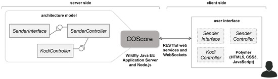 All user application components are grouped forming an architecture (left side of Figure 2). COScore is used for the deployment of these architectures offering several operations, including the management of the COTSgets specifications, the management of the COTSgets-based architectures, the instantiation of COTSgets components, the initialization of user applications based on the architectures, and the communication of components belonging to an architecture. All these capabilities are offered at run-time through web services. Regarding the technological aspects, COScore has been developed as a cloud service. It includes a JavaScript server (implemented with Node.js) used as a link with the user applications, and it makes use of WebSockets [20] (which requires the Socket.IO library [21]) to manage the communications. This way, the components forming the architectures can be communicated with each other by exchanging messages by using web sockets. Also, a Wildfly application server has been deployed (http://wildfly.org) in COScore for providing the services that are valid for all the platforms. Its functionalities are based on the component descriptions and their relationships, regardless of the platform on which they are deployed. This application server offers a set of RESTful web services developed with JAX-RS, which are called up by HTTP requests.
