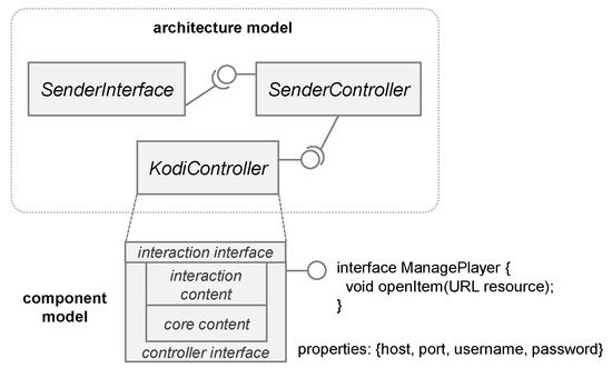 Also, each component contains a list of properties. Properties may provide information on non-functional properties (NFPs) (i.e., quality of service (QoS), component appearance, such as width, height, etc.) and any dependencies on other components. Some of these properties can be modified and should be taken into account at run-time. For example, four properties defined by the component KodiController are: (1) host, used to identify the host where KODI is installed; (2) port, used to indicate the port for the remote control of KODI via HTTP; (3) username and (4) password, used to indicate the user name and password to get control of KODI.