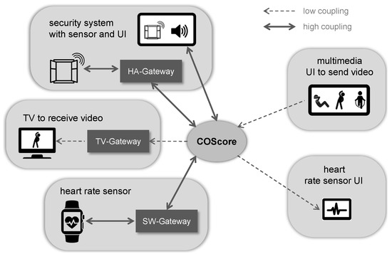 - Low coupling connection from a CPS to the COScore. This type occurs when a component (or a system) is intended to send data to another component (belonging to the same or to other system) through the COScore. In the example scenario, the multimedia UI of the personal trainer sends the video data to the TV system of the monitored customer with this kind of connection.