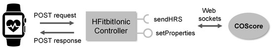 The SW-Gateway of the scenario is a software component intended to communicate (a) with the heart rate sensor of the smart watch; and (b) with the UI that shows a graphical representation of the heart rate. The first interoperability process is performed through the gateway implementation and it includes POST messages between the smart watch and the gateway software component to obtain the value of the heart rate. The second interoperability process is accomplished by using the COScore services as intermediate through a communication port of a required interface (see the software component, implementing the SW-Gateway in Figure 5, named HFitbitIonicController).