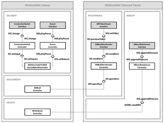 The first interaction is related to the security system. Capacitive sensors are used on the exterior windows and doors of the house connected to Raspberry Pi boards. These sensors are connected through an electro-conductive paint that extends over the surface of the window or door, thus enabling potential difference to be measured and using the measurement to detect the presence of an individual; allowing it to act as an intrusion detector. In the event that this happens, the system should set off a sound alarm (a device belonging to a multimedia system), to signal the alert of an unwanted presence and act as a deterrent effect. Figure 6 partially represents the architecture of the COTSgets components as stated. This architecture includes only those components necessary for the two cases of interaction which are posed. Two different installations are interconnected: installation 1 corresponds to the home user, while installation 2 to the personal trainer. In both installations, it can be observed how the different components are grouped in the aforementioned systems.
