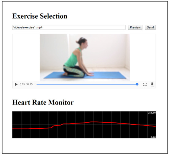 The second interaction proposed is established between two users. Suppose that the home user has contracted the services of a personal trainer, whose interaction is carried out by remote access. During the activity the trainer monitors his/her client and, based on the data obtained, sends the next exercise to be done. To do the exercise correctly, the trainer will send a demonstration video. In this case, the multimedia systems come into play with healthcare. In installation 1, the home user has a television which is connected to a Raspberry Pi board, now configured as a multimedia center (specifically it has a version known as KODI installed with its API JSON-RPC activated). Moreover, the user has a smart watch (Fitbit Ionic model) which has a heart rate sensor to measure heart rate. The personal trainer can select and preview a video from among a series of videos from the installation 2 (a URL of an external video link can be introduced) in order to send it directly to the television of the customer through the multimedia center. Furthermore, the system permits the monitoring of heart rate in real time and thus prevents whatever risk. Figure 7 shows a screenshot of the trainer’s UI which comprises the components DHKodiItemSenderInterface, DHVideoViewerInterface and HHeartRateSensorInterface.