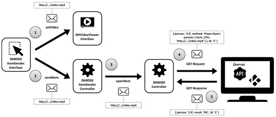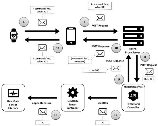 Returning to the architecture of the components in Figure 6, DHKodiController component has been incorporated into the installation 1, which enables communication with the API JSON-RPC of KODI, and the previously mentioned HFitbitIonicController, which receives information and also permits its transmission to the watch. It is essential to highlight the infrastructure used to obtain the data from the watch sensors. On the one hand, it has been necessary to develop an application for the watch and the mobile phone (with the FitBit application installed) to which it is paired. On the other hand, the installation of a web server with a digital certificate has also been necessary (to provide secure connections) which acts as a proxy. The personal trainer’s installation (installation 2) is made up of the controller components DHKodiItemSenderController and HHeartRateSensorController, together with their interface components DHKodiItemSenderInterface, DHVideoViewerInterface and HHeartRateSensorInterface, which interact as shown in Figure 8: