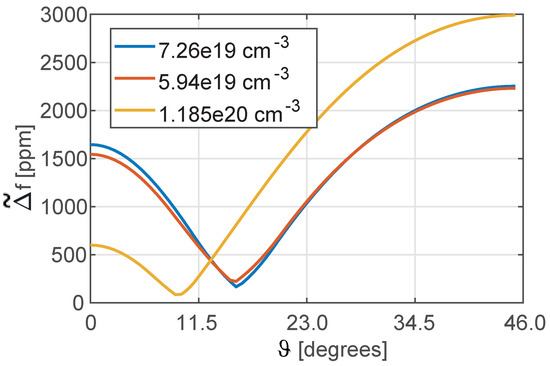 In Figure 4, the defined in (10) is reported for different levels of doping. Different minima are reached for each level: this confirms the already known result that the higher is the doping, the lower is the thermal drift of the MEMS resonator (see [9]). Moreover, each doping level is associated to a specific orientation of the mechanical structure that minimizes the . In Figure 5a, the countour of is plotted for different orientations of the mechanical structure and for a variety of n-doping levels (not only Phosporous is considered for this analysis for the sake of completeness). In Figure 5b, a curve of minima is extrapolated from Figure 5a. Please note that in Figure 5, the elastic constants and their temperature coefficients for a set of n-doping levels (see dots in Figure 5b) have been taken either directly from the values reported in Table 1 for different n-dopants and from their fitting, and for this reason they may not be fully coherent being referred to different fabrication processes.