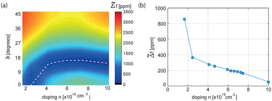 (a) for different orientations of the device with respect to the silicon wafer and for different n-dopings of the silicon. The white dotted line represents the minima of the contour plot. (b) Minimum temperature variation of the natural frequency of the resonator for different n-dopings of the silicon.