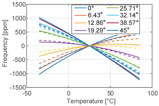 Temperature variation of the frequency of the tuning fork in the range [−35 °C–85 °C] for different orientations of the device with respect to the silicon wafer. Dotted lines denote numerical results, while continuous lines represent the analytical solution shown in Figure 3.