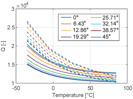 Temperature variation of the quality factor of the tuning fork in the range [−35 °C–85 °C] for different orientations of the device with respect to the silicon wafer. Dotted lines denote numerical results, while continuous lines represent the analytical solution shown in Figure 6.