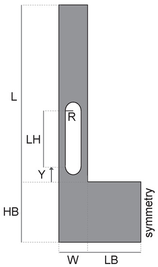 where Y, R, LH, L, W, LB and HB are the geometric quantities shown in Figure 9 while defines the orientation of the resonator (see Figure 1): = 0° refers to the alignment of the -axis with the [100] direction of the silicon wafer as previously stated.