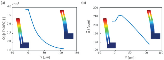 As an example, and with reference to the dimensions of Table 2, in Figure 10a the quality factor computed numerically at 25 °C for different positions of the slots is reported, while in Figure 10b the corresponding frequency variations are shown. Please note that the position Y of the hole in the resonator influences both the quality factor and the .