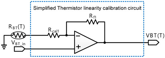 Namely, the coefficient of the quadratic term will become 0 by selecting with an appropriate resistance. Besides, this work adds more calibration resistors and feedback resistors to enlarge the sensing temperature and maintain the high linearity of the . Therefore, thermistor linearity calibration circuit with switches changes sensing temperature range by selecting the appropriate calibration resistor and feedback resistor. Referring to Equation (2), is derived to attain the following result: