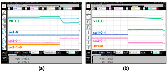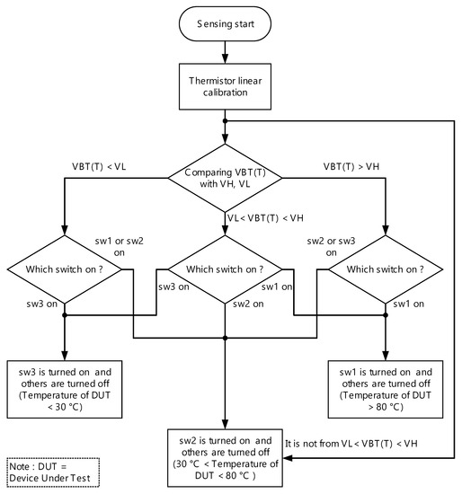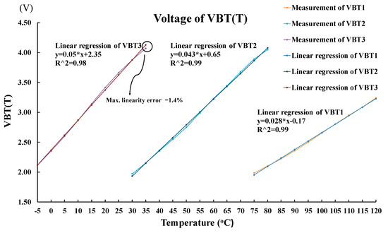 Figure 4 shows the illustration of the output of thermistor linearity calibration circuit with one of the three switches turned on. Namely, three different output voltage curves (VBT1, VBT2, and VBT3) are corresponding to the output voltage curves of in −5–35 , 30–80 , and 75–120 , separately, in our design. VH (voltage high) and VL (voltage low), which are external DC bias voltages, are the reference voltages of temperature range auto-selecting circuit. VH is set to the maximum voltage of VBT2 and VBT3. By contrast, VL is set to the minimum voltage of VBT1 and VBT2. If > VH or < VL, temperature range auto-selecting circuit turn off the current switch and turn on another switch depending on higher than VH or lower than VL. On the other hand, when the is between VH and VL, it means that the thermistor linearity calibration circuit has been selected to the correct sensing temperature range. In addition, the sensing temperature ranges t1~t2 and t3~t4 are overlapping sensing temperature ranges of VBT3, VBT2, and VBT1, respectively. If there is no overlapping between two adjacent ranges, a bouncing hazard will occur between adjacent range selections when the temperature is close to the switch point of two adjacent ranges.