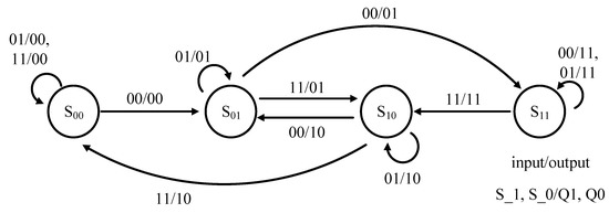 A total of four states are required for temperature range auto-selecting circuit, which are S00, S01, S10, and S11. They are, respectively, described as shown in Figure 7. Referring to Figure 5 again, the inputs of this state machine is S_1 and S_0. By contrast, the outputs of this state machine is Q1 and Q0.