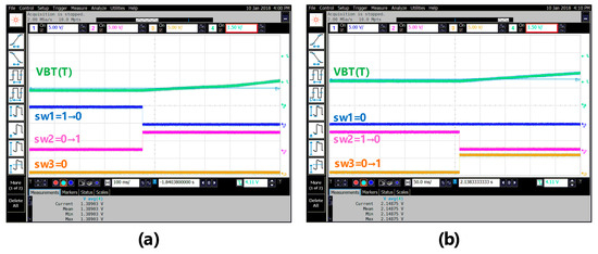 Figure 10 shows the scenario of three switches when the ambient temperature is changed: (a) from 35 °C up to 40 °C and (b) from 80 °C up to 85 °C. Referring to Figure 10, when the ambient temperature changes from low to high, the switch is turned on in sequence from sw3 to sw2 and then to sw1. By contrast, the scenario of the three switches, when the ambient temperature varies: (a) from 70 °C down to 65 °C and (b) from 30 °C down to 25 °C, is shown in Figure 11. Referring to Figure 11 again, when the ambient temperature changes from high to low, the switch is turned on in sequence from sw1 to sw2 and then to sw3. To make sure that the proposed chip is functional in the range of −5 °C to 120 °C, a total of 26 temperature cases, i.e., −5, 0, 5, …, 120 °C, are tested and measured. Figure 12 summarizes the measurement result of the . The maximum error with respect to a linear asymptotic line is as low as 1.4%. Then, the error of the sensed temperature compared with the real temperature is attained in Figure 13. The maximum error with respect to real temperature is as low as 1.1 °C (3.1%).