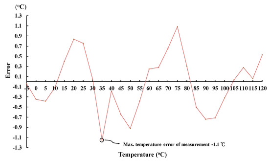 The performance comparison of the proposed design and several recent works is tabulated in Table 2. Notably, the proposed design attains the widest sensing temperature range, which is the range of −5 °C to 120 °C. Notably, the maximum error 1.1 °C, which is also the best to date.