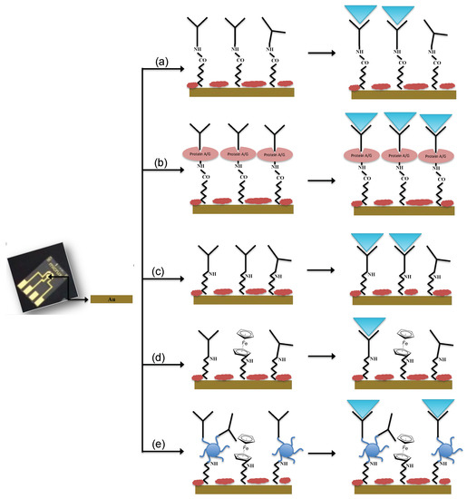 For Scheme (d), ferrocene carboxylic acid solution was at first activated with a solution of 75 mM EDC and 15 mM NHS in 100 mM MES buffer (pH 7.4) for 2 h; then, it was dropped on cysteamine modified electrode for 1 h. After that, cysteamine 20 mM was dropped overnight on the surface of the electrode. The link between cysteamine and Ab (1.4 ng/mL) was carried out using glutaraldehyde solution 5% (v/v). Finally, ethanolamine (1 M) was used to block the unreacted active sites. At the end of each step, the electrode was rinsed in PBS.