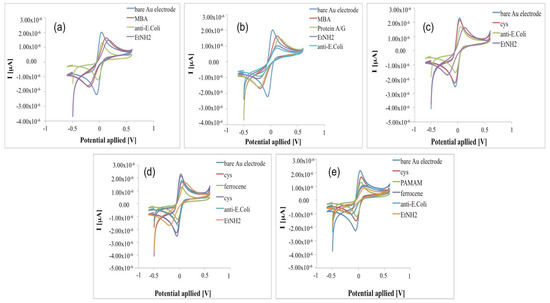 The voltammograms of Au electrodes display well defined anodic and cathodic peaks due to the reversible interconversion of the redox probe K3[Fe(CN)6]/K4[Fe(CN)6]. After the Au electrodes were covered with short-chain thiols of MBA (immobilization Schemes a and b—Figure 2a,b) and cysteamine (immobilization Schemes c, d and e—Figure 2c–e), the response current decreases due to the MBA and cysteamine layers, which hinder the redox probe on the electrode surface [10,18].