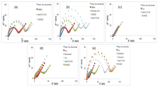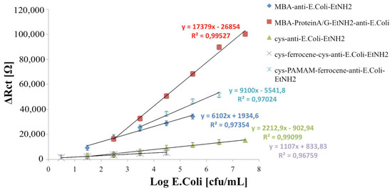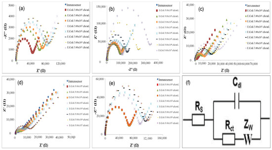 When the developed immunosensors react with increasing concentration of E. coli cells, in all cases, an increase of semicircle diameters of Nyquist plots was observed (Figure 4), which correspond to the charge transfer resistance Rct of the common Randle’s Circuit used for data fitting (Figure 4f).