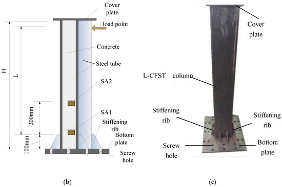 As the first step to fabricate the L-CFST specimens, two smart aggregates (SAs) were tied to steel bars, as shown in Figure 2a, and then fixed at the center of a 75 mm diameter PVC (Polyvinyl Chloride) tube mold, into which the concrete was poured. The distance between the two smart aggregates is 200 mm, as shown in Figure 2b,c. After the concrete was poured and solidified, the mold was removed and placed at the bottom of L-CFST column, as shown in Figure 1. Then, as the second step to fabricate the specimens, the concrete was poured in the mold of the L-CFST column. The concrete strength level of the poured concrete is the same as that of the concrete in the previous mold. The curing of the specimen and the welding of the cover plate after the pouring were completed. The geometric center of the cover was aligned with the geometric center of the hollow steel tube.