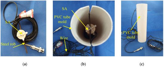 The procedure of embedment of SA. (a) The SA prior to embedment; (b) The placement of SA; (c) A photo of the PVC mold.