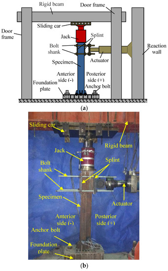 The schematic and physical diagram of this test device are shown in Figure 3a,b. The maximum displacement of the actuator is 500 mm. The axial load is applied to the top of the specimen through a 1000 kN jack.