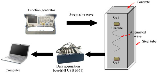 At present, the methods of structural damage detection include X-ray, acoustic emission, and ultrasonic methods [16,17], among others. Carpinteri et al. [18] used acoustic emission (AE) technology to evaluate visual cracks in reinforced concrete of a multi-story building. Behnia et al. [19] reviewed the application of acoustic emission technology to the health monitoring of concrete structures. Rucka and Wilde [20] studied the cracks of reinforced concrete structures under tensile stress by the ultrasonic method. Antonaci et al. [21] used linear or nonlinear ultrasonic methods to detect the compressive damage of circular concrete columns. Yue et al. [22] developed a damage detectability model of pitch-catch configuration using lamb waves for composite plates