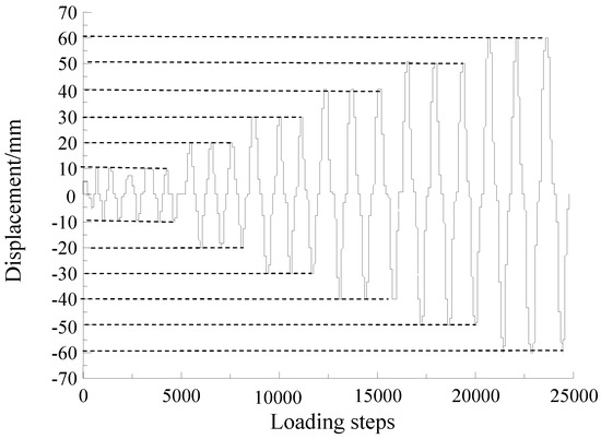 Before the test, preloading along the axial direction was applied twice to stabilize the load and deformation of the specimen, and then the vertical axial force is increased to the full load. Preloading was also applied laterally twice to eliminate the non-uniformity in the steel column and to check the performance of the instrumentation. The displacement control loading method was used in this test. First, the yield displacement of the specimen was estimated. At the initial stage of loading, when the displacement did not exceed the yield displacement, the loading displacement was loaded in incremental increments of less than 5 mm, and each load was performed once. When the displacement exceeded the yield displacement, the control load was applied with a multiple of the displacement, and each loading displacement was repeated three times until the lateral loading force of the specimen fell below 85% of the peak loading force, and then the loading was stopped. The specimen was considered to have been totally damaged at this stage. The test loading schedule is shown in Figure 4.