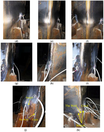 The test phenomenon of the specimen L-CFST2 is described as follows, and the test phenomena of other specimens are basically similar. During working conditions 1–6, the specimen has no obvious change, and during working condition 8, side 1 of the specimen appears slightly buckled. During working condition 13, the side 3 of the specimen appears slightly buckled, and during working condition 14, the negative lateral load of the specimen reaches the peak (Pmax = −102.272 kN). At working condition 20, side 2 of the specimen appears slightly buckled, and at working condition 25, side 4 of the test piece specimen appears buckled and the lateral load reaches its peak (Pmax = 110.920 kN). At working condition 32, side 6 of the test specimen appears buckled and the weld of the specimen is cracked. At working condition 35, the weld of the specimen is cracked, and the lateral load of the specimen has dropped to 85% of the peak value, and the experiment stops loading. In the test, the buckle locations of the specimen side are found to be about 5–9 cm above the stiffener, and the buckle of the side increases with the subsequent load. The images of the buckle on the side are shown in Figure 8a–k.