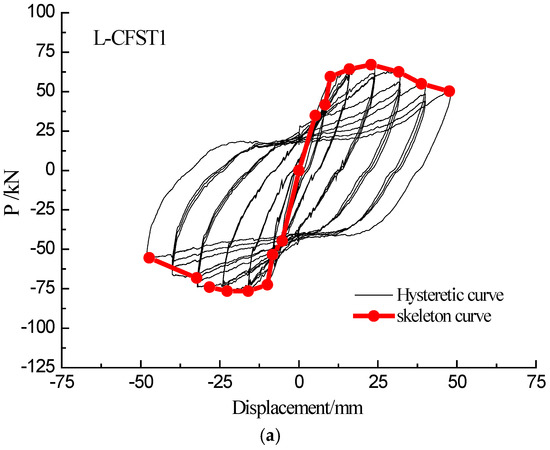 The lateral force-displacement curve under the low-frequency cyclic loading clearly shows the hysteretic effect. The hysteretic loops effectively reflect the seismic performance of the specimen, including the energy dissipation performance of the specimen. A skeleton curve refers to an envelope curve of hysteresis loops and is drawn by concatenating the peak points of the first cycle. The skeleton curve shows the peak point trajectory of the horizontal force of the CFST column under various displacements, and it reflects the ductility and strength change of the specimen during the entire loading process.