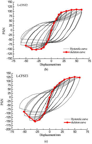 The skeleton curve and hysteresis loops of L-CFST2 specimen are described here, and the other specimens are basically the same. The skeleton curve and hysteresis loops of the L-CFST2 specimen are shown in Figure 9b. It shows that the skeleton curve is basically a straight line when the specimen loading displacement is between 0–10 mm, and the L-CFST2 specimen is in the elastic stage from the skeleton curve. At this time, the external steel tube has not been yielded, and the external steel tube has a large constraining effect on the concrete core of specimen column. The cracks and damages of the concrete core increase slowly. It also shows that there is no buckle in the external steel tube during the loading process based on the experimental phenomenon. When the specimen loading displacement is between 10 mm–50 mm, the skeleton curve shows a nonlinear saturating curve. At this time, the specimen is in the yielding stage, the steel tube starts to buckle gradually, and the confinement effect of the steel tube on the internal concrete decreases, causing the gradual increase of the damages in the concrete core area. The lateral load reaches the peak when the displacement is 50 mm, then the load value continues to fall, and the skeleton curve is in the descending section, and the weld cracks. As a result, the internal concrete completely losses its compressive capacity.